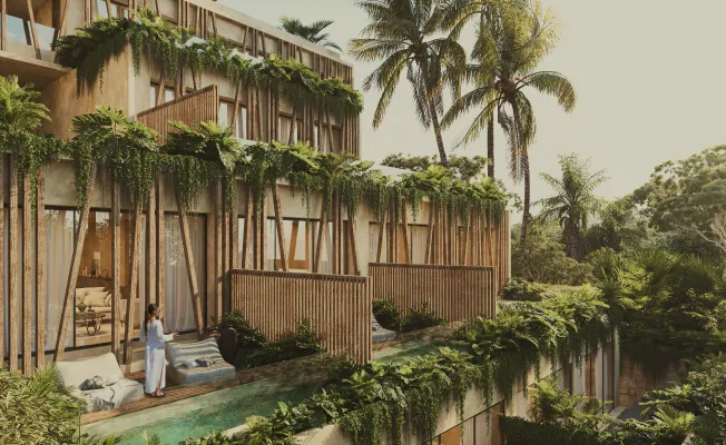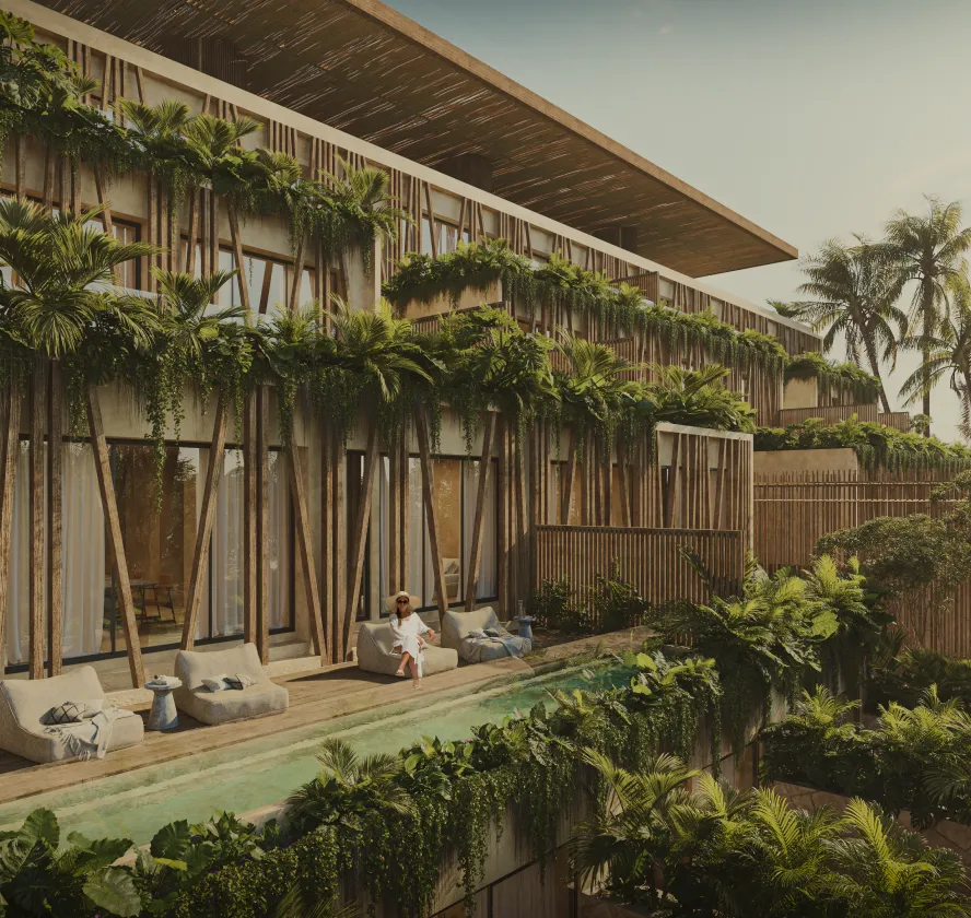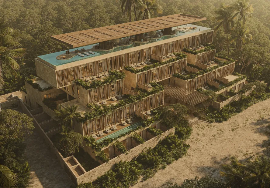 En el punto más alto del edificio, el rooftop ofrece vistas abiertas a la selva de Tulum.